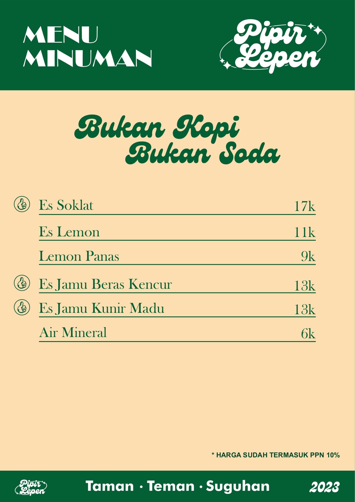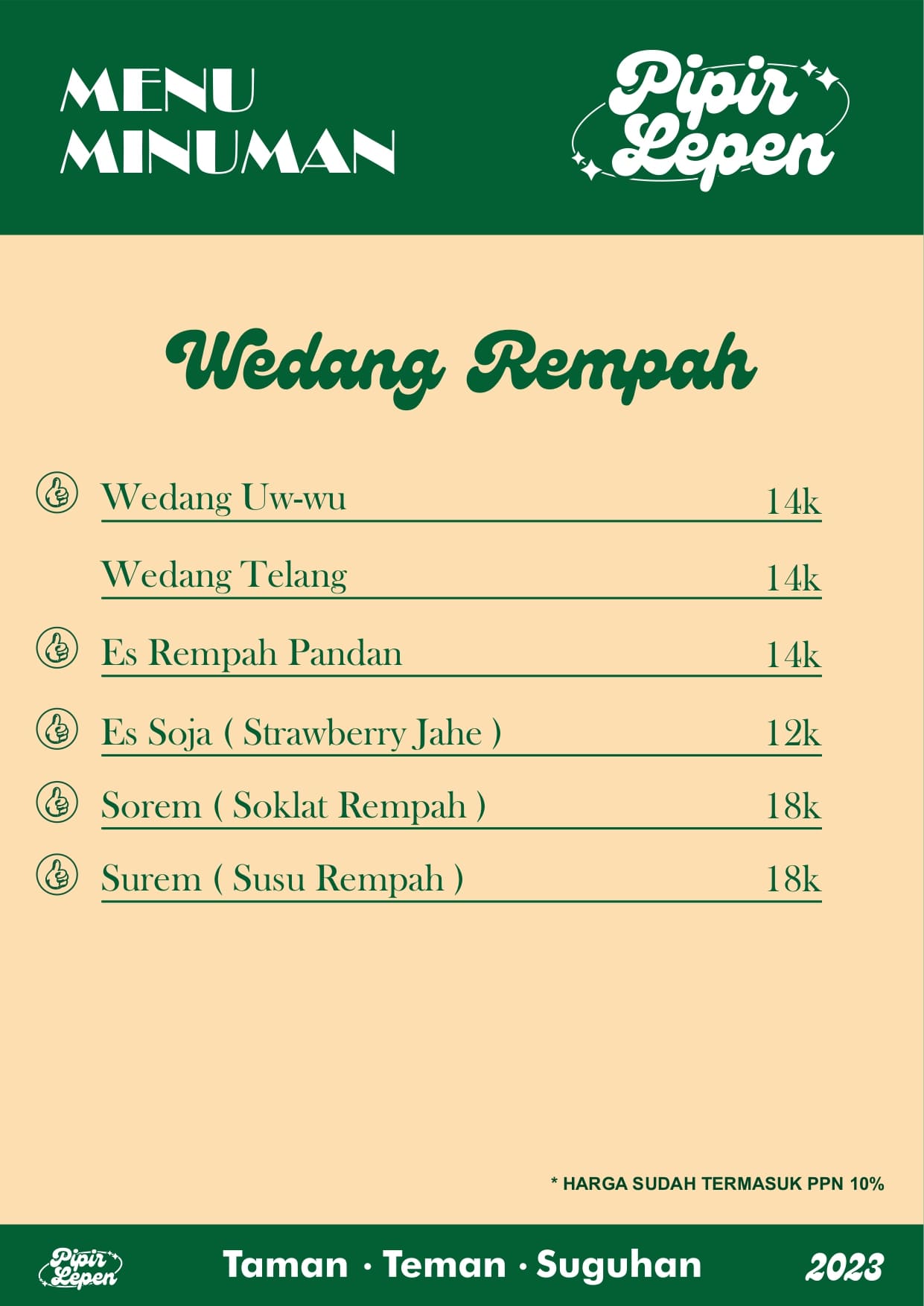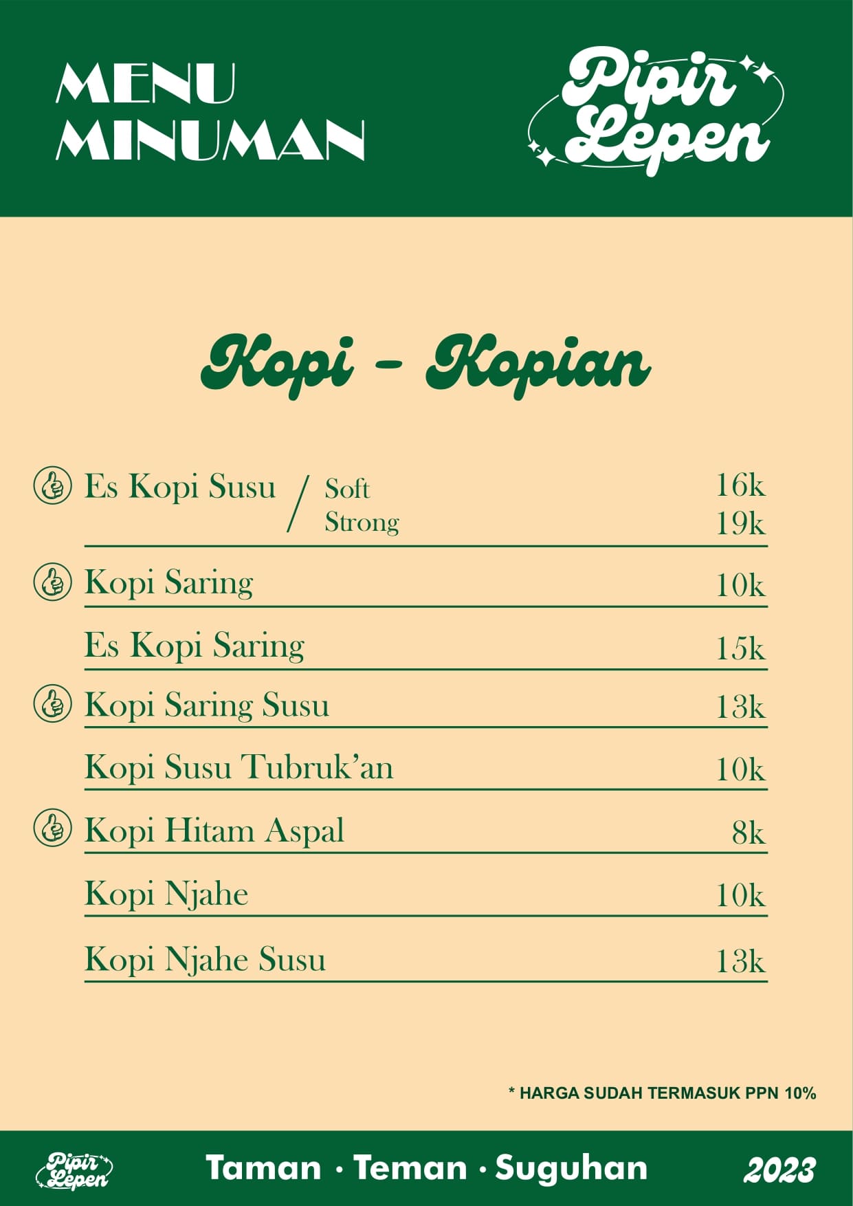 Pipir Lepen ini beneran jadi tempat nongki asik yang murah meriah. Makanya hampir selalu rame banget tapi tenang aja seatingnya cukup banyak kok.