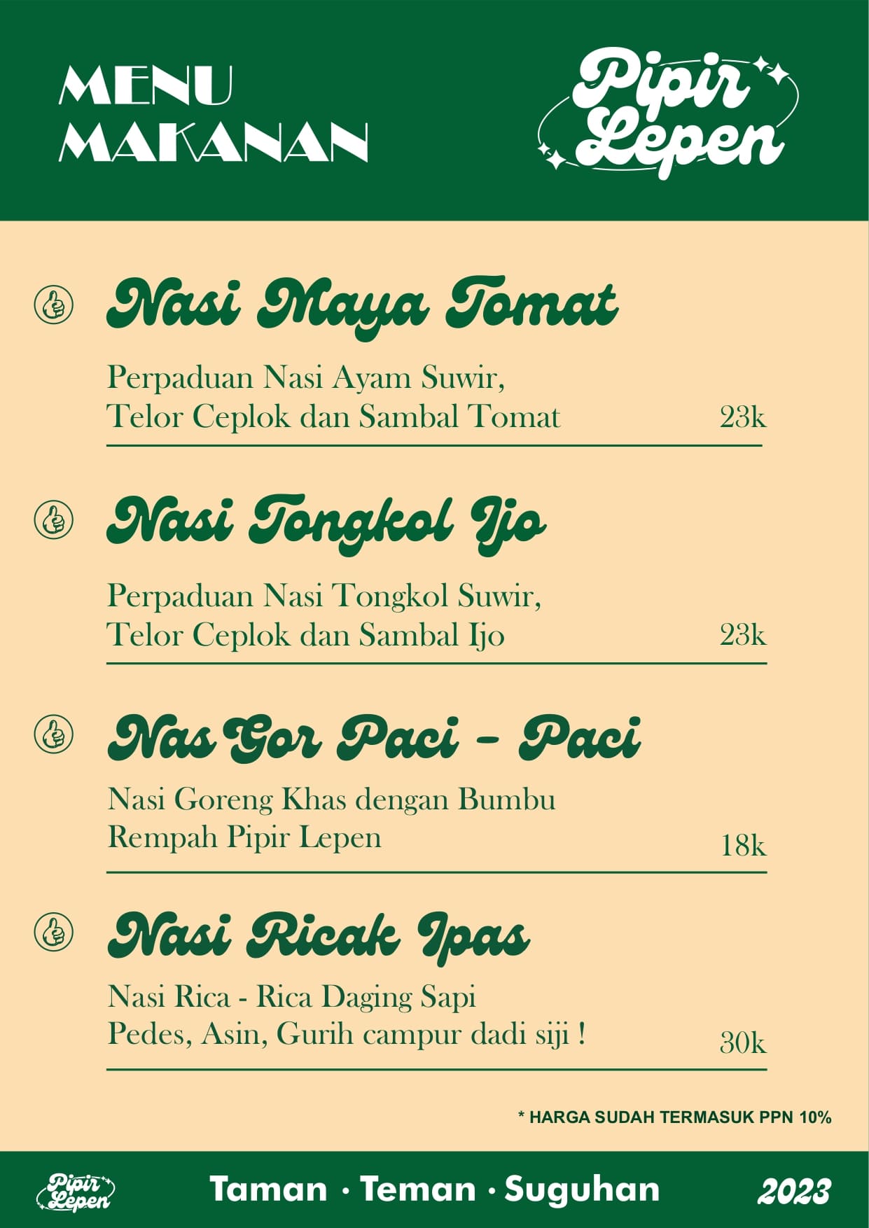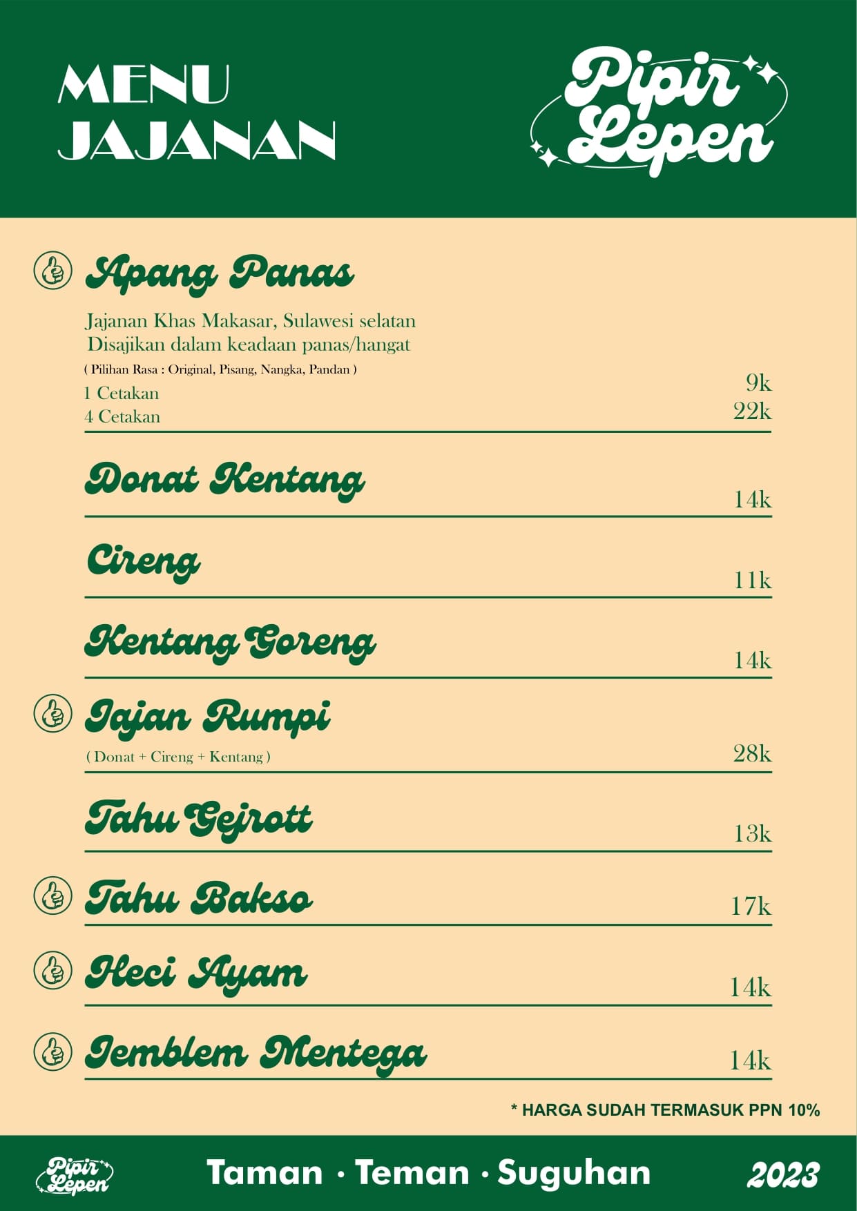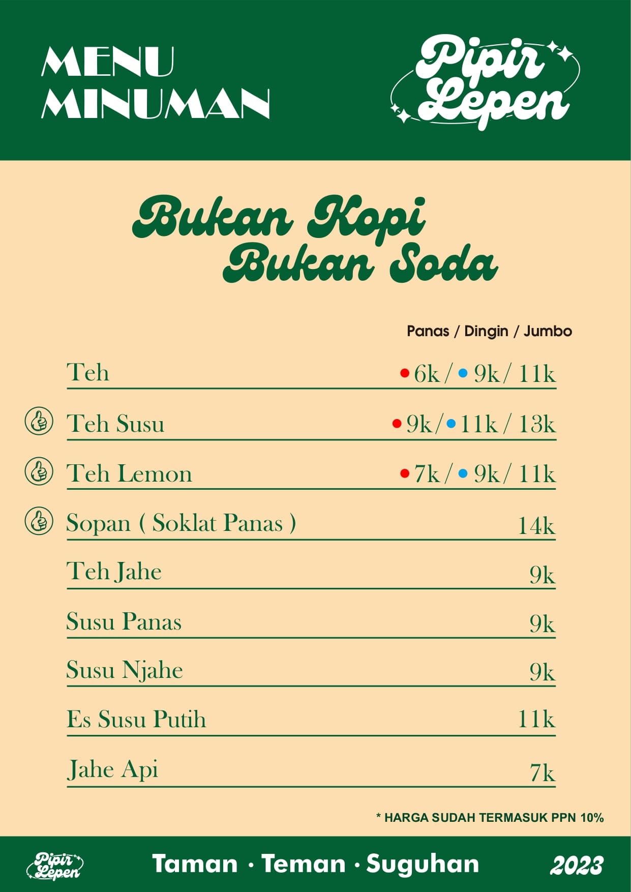 Pipir Lepen ini beneran jadi tempat nongki asik yang murah meriah. Makanya hampir selalu rame banget tapi tenang aja seatingnya cukup banyak kok.
